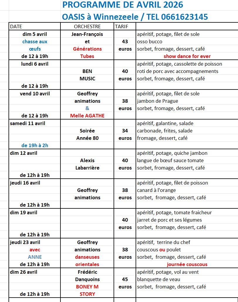 Repas et thé dansant tout les dimanches ainsi que les jours de semaine suivant planning