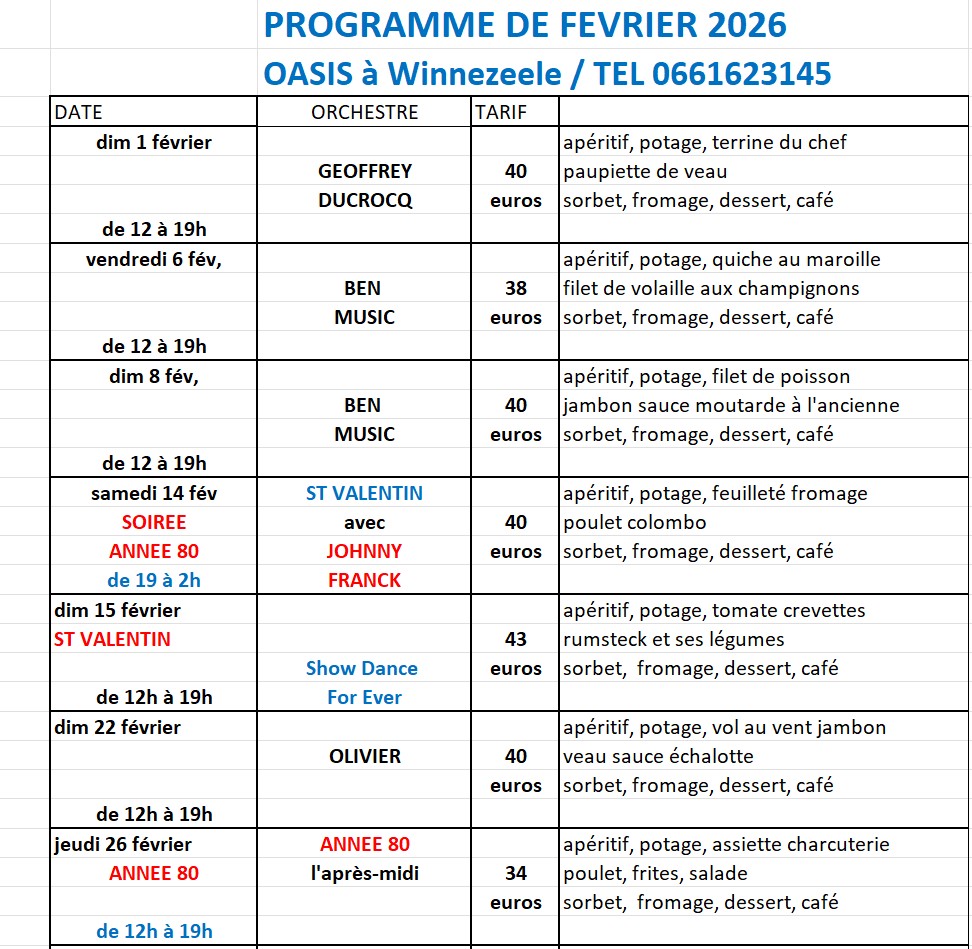 Repas et thé dansant tout les dimanches ainsi que les jours de semaine suivant planning