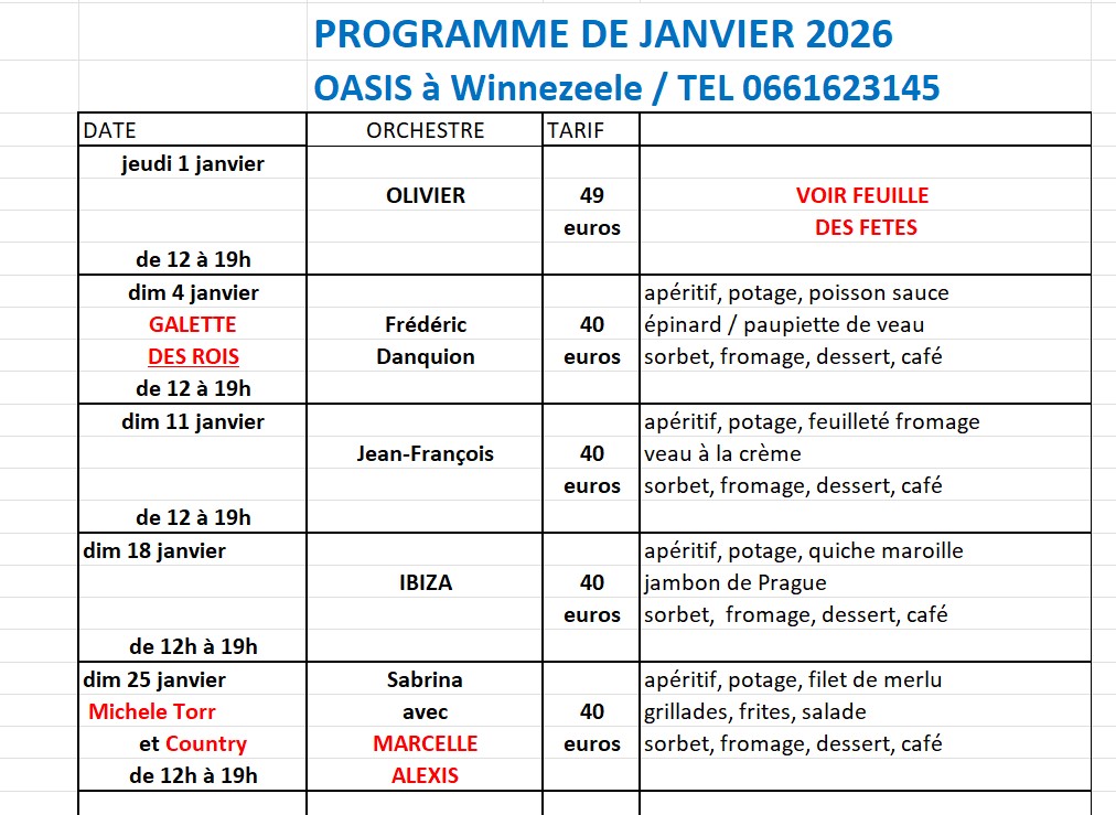Repas et thé dansant tout les dimanches ainsi que les jours de semaine suivant planning